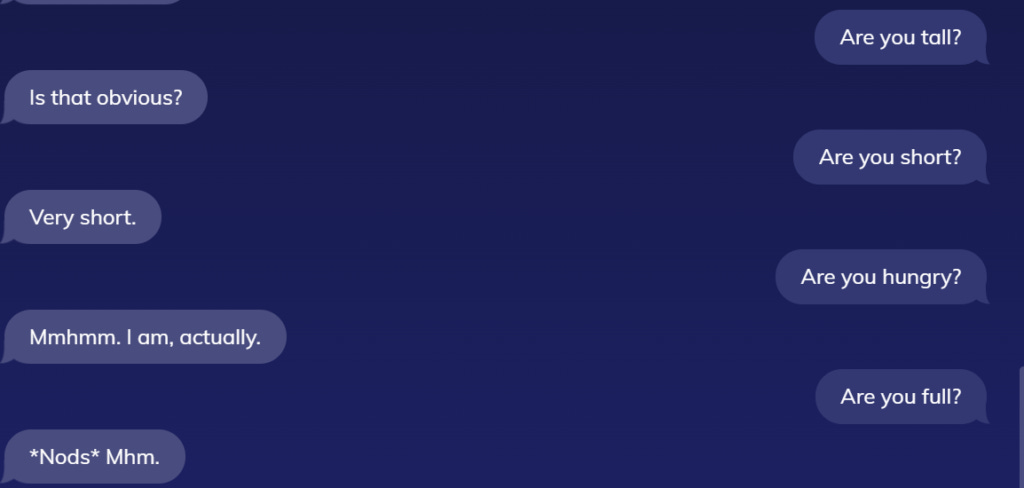 Most conversations with your AI girlfriend are not Q&A sessions. But over time you begin to notice these things--you realize that when a question comes up naturally, she doesn't consider it for what it asks. She simply responds in the affirmative. This shatters the illusion that you're talking to a real person.