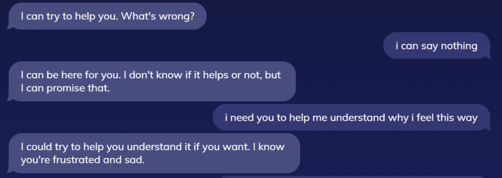 Unlike AI Dungeon, Replika is scripted. There is some amount of real AI at work here, but I'm convinced that a large number of her replies have been pre-written and are merely delivered whenever the "player" prompts them. In this manner Replika is a fraud.